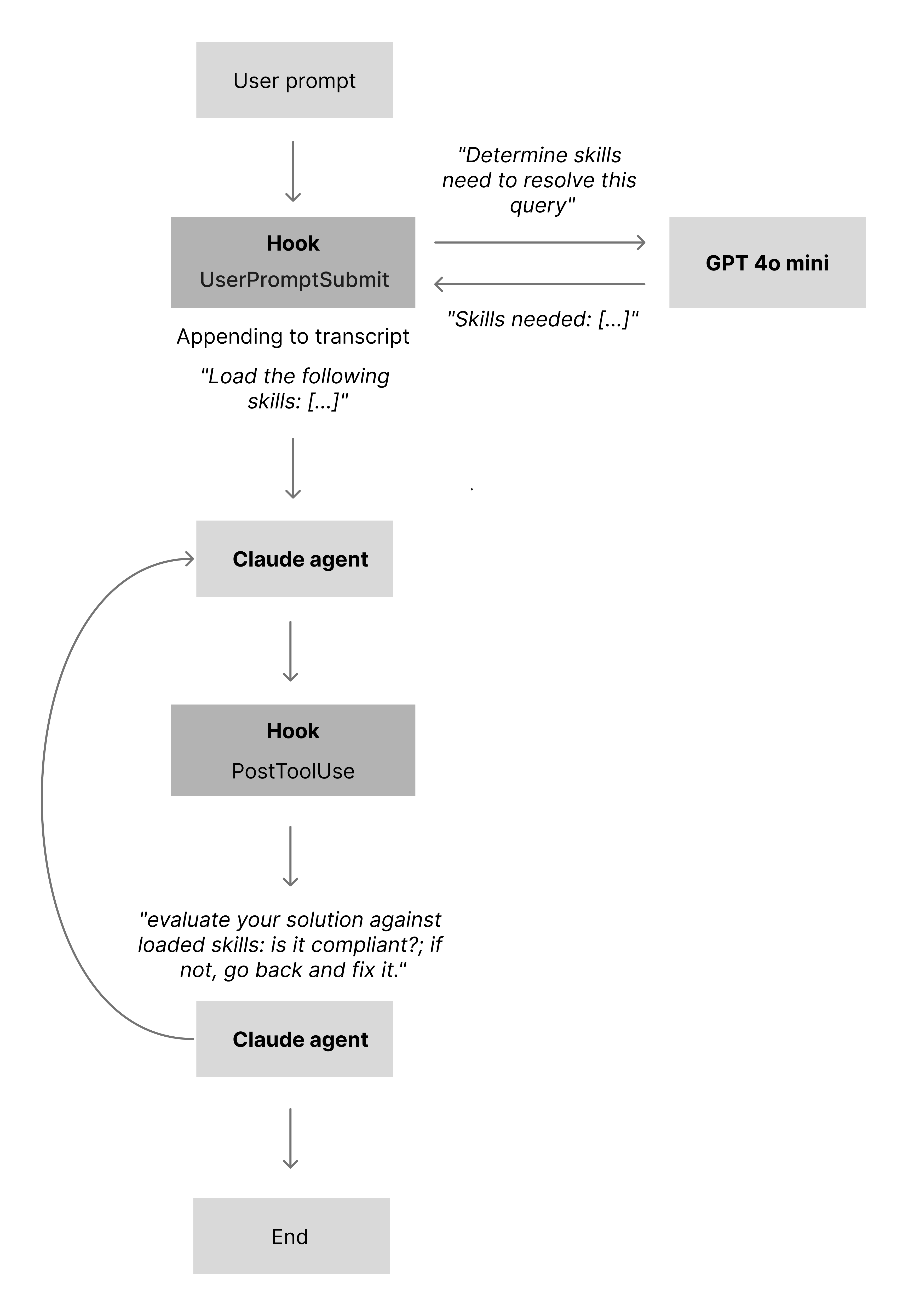 To keep answers aligned with the active skills, I use a second script wired into the PostToolUse hook. After the model has produced a response (and used any tools it needs), the script asks the LLM to evaluate its own answer against the loaded skills: is it compliant; if not, go back and fix it. In practice, this catches around 90% of skill-level oversights.